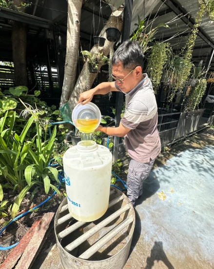“หลังจากเตรียมขยะพร้อมแล้ว ก็นำไปใส่ในเครื่องอบที่สร้างขึ้นมาเอง มันจะผ่านความร้อนที่เราตั้งไว้ แล้วแยกออกมาเป็นน้ำมันเองเลย”